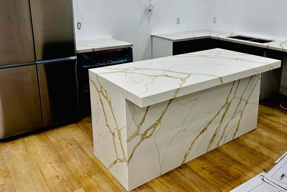 We carefully align veining and fabricate precise miters to create a seamless, high-end waterfall appearance.